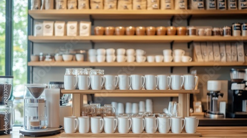 ai, cafes, hot drink, shop, interior, cup, shelf, bag, barista, drink, espresso, cafes, bean, brew, morning, aroma, seating, wooden, aesthetic, cosy, beverage, mug, equipment, service, client, caffeine, tea, pastry, ambience, local, craft, decor, rustic, light, warmth, hospitality, relaxation, community, gathering, modern, counter, display, supply, retail, refreshment, brewing, machine, preparation, daily
