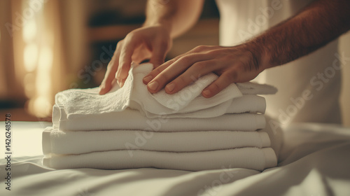 hand, towel, bed, linen, fold, room, morning, sun, men at work, housekeeping, cleanliness, service, fabric, stack, guest, care, hotel, hospitality, routine, comfort, stay, relaxation, neatness, preparation, smoothness, softness, responsibility, touch, duty, hygiene, furnishing, maintenance, professionalism, detail, schedule, accommodation, support, staff, quiet, presence, peace, luxury, handcraft, atmosphere, management, freshness, attention, order
