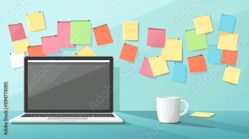 Neatly organized desk featuring a closed laptop, mug, and sticky notes on a bright and airy background.