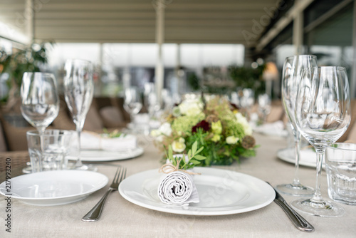Neatly twisted into a tube dining room napkin decorated with a sprig of pistachio. Wedding Banquet or gala dinner. The chairs and table for guests, served with cutlery and crockery. party on terrace