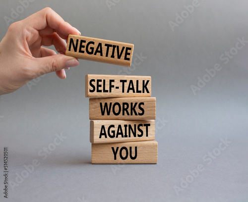 Negative self-talk works against you symbol. Concept words Negative self-talk works against you on wooden blocks. Beautiful grey background. Businessman hand. Psychological concept. Copy space