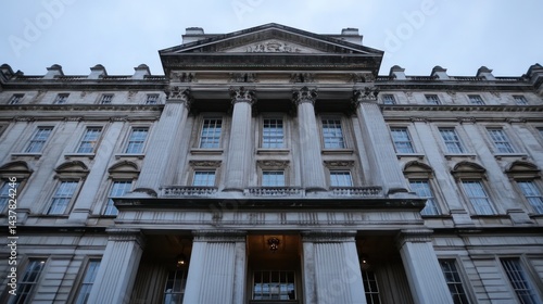 Neoclassical London building, twilight, city backdrop, government
