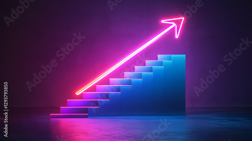 Neon arrow ascending a staircase, symbolizing growth, success, and upward trajectory. Perfect for business, technology, or motivational concepts.