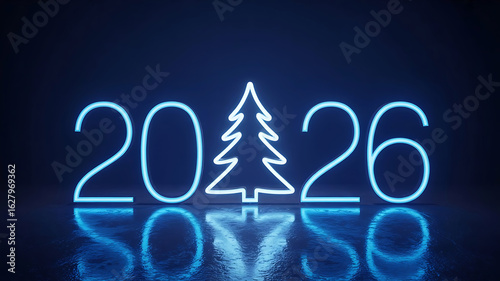 2026, christmas, new year, neon, blue, light, glowing, christmas tree, signs, year, number, holiday, festive, modern, graphic, design, digital, illustration, abstract, background, wallpaper, minimalist, celebration, event, party, trendy, technology, geometric, style, contemporary, light effect, water, wet, surface, digital artwork