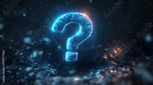 Neon blue glowing question mark floating against a dark, starry background with a digital aura.