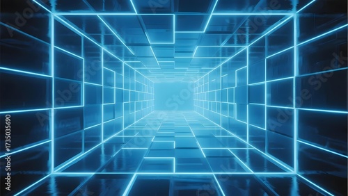 neon, grid, tunnel, futuristic, corridor, blue, digital, technology, abstract, light, three-dimensional, perspective, cyber, virtual, laser, geometric, pattern, space, modern