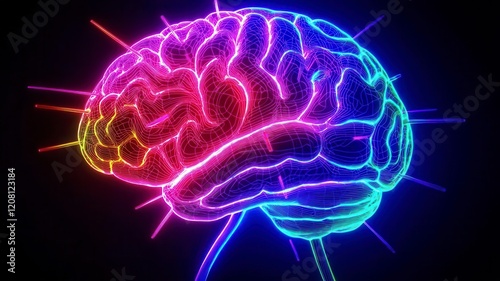 Neon brain creative neural on black background. A vibrant, neon-colored depiction of a brain, radiating energy and creativity against a dark background.