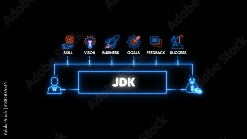flowchart, business, neon, skill, vision, goal, feedback, success, money, bag, person, rocket, light, bulb, computer, graph, gear, line, blue, orange, white, black, background, concept