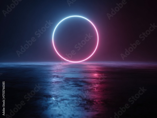 neon, circle, light, glow, pink, blue, water, abstract, empty, dark, space, modern, geometric, design, three-dimensional, surface, studio, background, image, colours, gradient, symmetry, shape, effect, digital, art, illustration, empty space, blank, illumination, circular, vibrant, fluid, horizon, calm, still, beam of light, geometric shape, neon light, visual, background