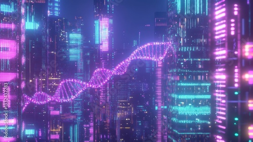 city, neon, deoxyribonucleic acid, helix, futuristic, urban, technology, glowing, light, pink, purple, blue, architecture, building, city landscape, night, vibrant, digital, art, graphic, design, illustration, three-dimensional, render, modern, science, genetic, innovation, progress, evolution, growth, advancement, future, hallucinogen, glow, light, pattern, abstract, digital artwork, animation, rendering, image