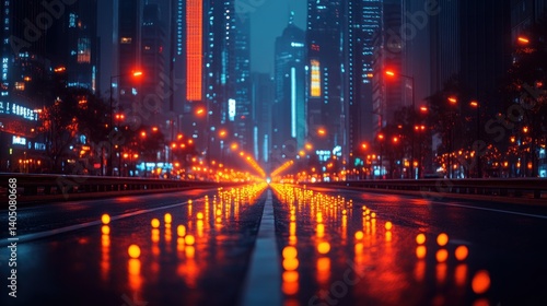 Neon City Nightscape: A Wet, Luminous Road Through Urban Metropolis