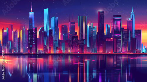 city, skyscraper, night, urban, sunset, neon, light, building, city landscape, metropolis, water, modern, architecture, illustration, digital, art, artwork, graphic, design, vibrant, colours, purple, pink, blue, red, orange, glow, shine, bright, nightlife, skyline, horizon, scene, view, landscape, panorama, image, painting, drawing