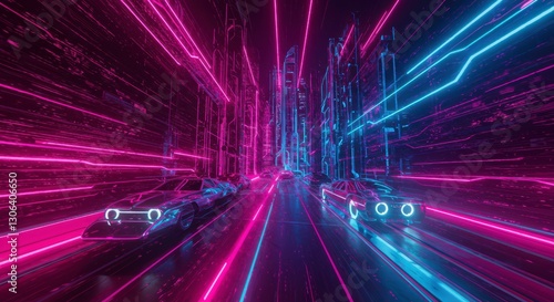 Neon Cityscape Drive: Futuristic cars glide through a vibrant neon cityscape, bathed in contrasting pink and blue lights, creating a dynamic and otherworldly scene.