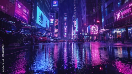 city, street, rain, night, neon, light, wet, asphalt, building, skyscraper, urban, landscape, dark, colourful, high-coloured, bright, illuminated, gloomy, atmosphere, drizzle, dripping, car, vehicle, traffic, street light, signs, advertising, window, nightlife, modern, futuristic