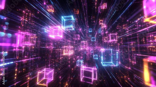 cube, neon, digital, abstract, three-dimensional, render, glowing, geometric, shape, space, technology, future, datum, network, cyberspace, light, colours, purple, pink, blue, orange, line, motion, energy, dynamic, vibrant, art, graphic, design, illustration, background, texture, pattern, visual, effect, science fiction, fantasy, virtual, reality