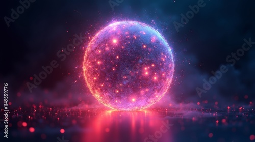 Neon energy sphere of particles and waves of magical glowing. Abstract round shape.