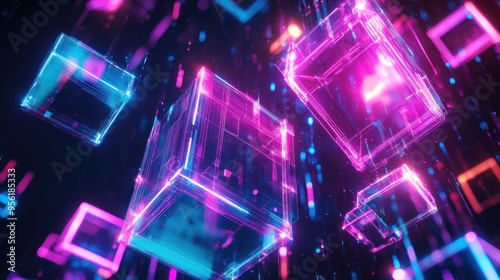 abstract, art, digital, geometric, three-dimensional, design, neon, glowing, futuristic, technology, graphic, graphic, background, illustration, style, light, modern, shape, pattern, high-coloured, colourful, colours, pink, blue, purple, line, structure, virtual, concept, visual, render, science, fiction, effect