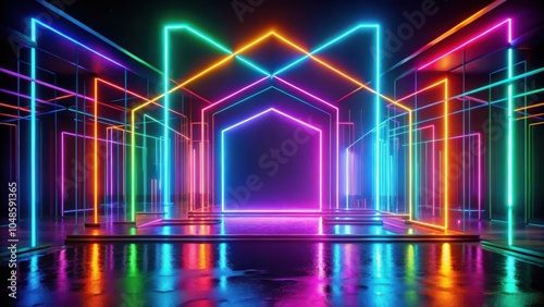 neon, glow, geometric, abstract, wet, surface, colourful, light, bright, futuristic, modern, design, vibrant, energy, night, dark, digital, graphic, art, abstract art, modern art, digital artwork