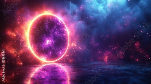 neon glow illuminating a round frame in a futuristic style, with a defocused purple color glitch effect, creating a striking visual that evokes a sense of technology and abstract art