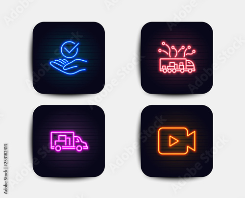 Neon glow lights. Set of Approved, Truck delivery and Truck transport icons. Video camera sign. Verified symbol, Logistics, Delivery. Movie or cinema. Neon icons. Glowing light banners. Vector