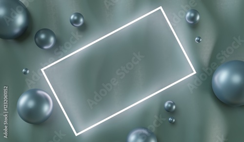 Neon glowing frame on canvas and floating beads. 3D illustration.