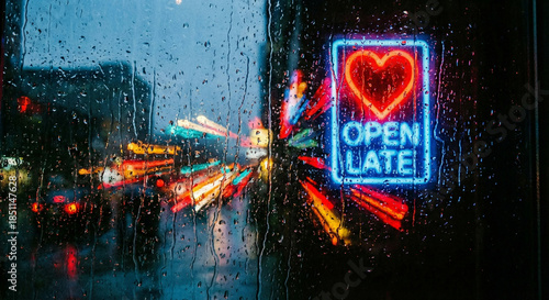 Neon heart sign saying open late seen through a rainy window at night