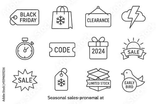 icon, seasonal, sale, neon, black, friday, clearance, shopping, discount, timer, code, 2024, sale, price, tags, gift, package, limited, stock, early, bird, thunderbolt, bag, marketing, deal, retail, commerce, glowing, symbol, offer, flash