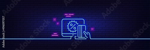 Neon light glow effect. Online shopping line icon. Sale discount sign. Black friday symbol. 3d line neon glow icon. Brick wall banner. Online shopping outline. Vector