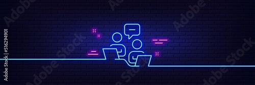 Neon light glow effect. Teamwork line icon. Remote office sign. Team employees symbol. 3d line neon glow icon. Brick wall banner. Teamwork outline. Vector
