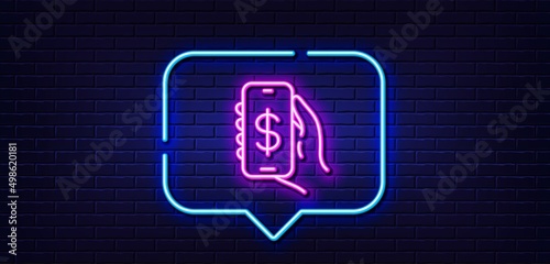 Neon light speech bubble. Money app line icon. Hand hold phone sign. Cellphone with screen notification symbol. Neon light background. Money app glow line. Brick wall banner. Vector