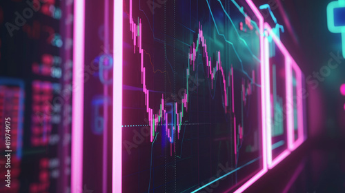 Neon lights illuminate financial graphs, indicating the pulse of the stock market's activity.