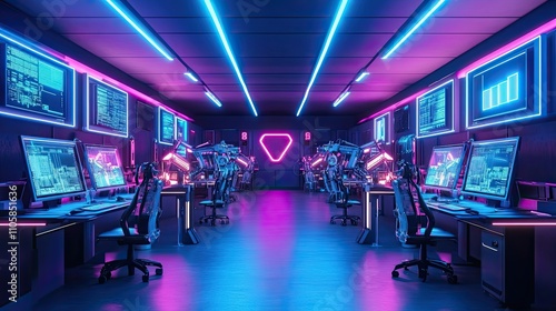 Neon Lit Cyber Gaming Station With Multiple Workstations