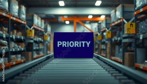 Neon Lit Priority Package on Futuristic Conveyor Belt in Vibrant Warehouse Setting