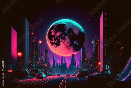 moon, city landscape, neon, night, futuristic, light, highway, car