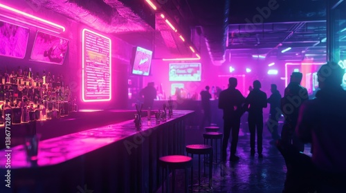 bar, nightclub, neon, light, club, night, purple, pink, scene, atmosphere, dark, people, crowd, interior, lighting, stylish, modern, futuristic, retro, vibrant, energy, glow, electric, digital, 80s, style, design, artistic, aesthetic, urban, trendy, cool, hip, contemporary, alcohol, drink, bottle, seating