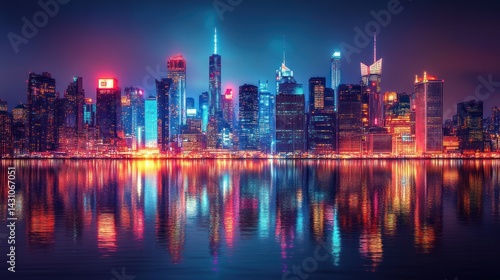 Neon Nightscape: Manhattan Skyline Reflection