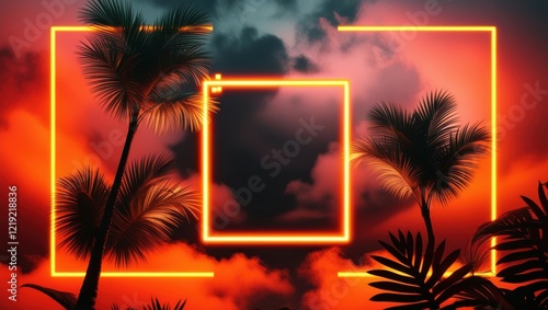 Neon orange square frame, tropical sunset backdrop, silhouetted palm leaves, vibrant warm colors, glowing portal, surreal landscape, futuristic aesthetic, digital art, otherworldly atmosphere, symmetr