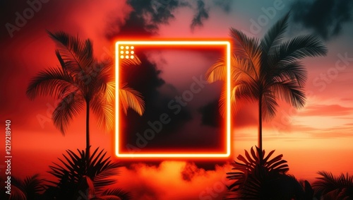 Neon orange square frame, tropical sunset backdrop, silhouetted palm leaves, vibrant warm colors, glowing portal, surreal landscape, futuristic aesthetic, digital art, otherworldly atmosphere, symmetr