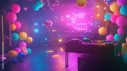 party, dj, mixer, neon, light, balloon, decoration, setup, event, music, entertainment, colourful, vibrant, festive, celebration, nightlife, club, disco, dance, fun
