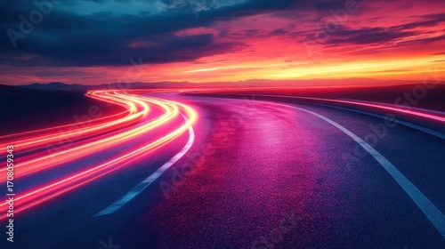 neon, road, sunset, time, light, winding, asphalt, path, landscape, travel, speed, motion, blur, night, sky, cloud, horizon, transportation, drive, adventure, future, technology, modern, curve, perspective, scenic, destination, exploration, journey, route, highway, speedway, long exposure, illuminated, glowing, vibrant, colourful, dynamic, energy, motion blur