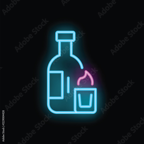 Neon sign of a bottle pouring a shot glass of alcohol, perfect for themes of nightlife or alcoholism
