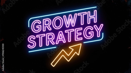 Neon Signage: Vibrant 'Growth Strategy' Text with Upward Arrow – Ideal for Business and Marketing Concepts
