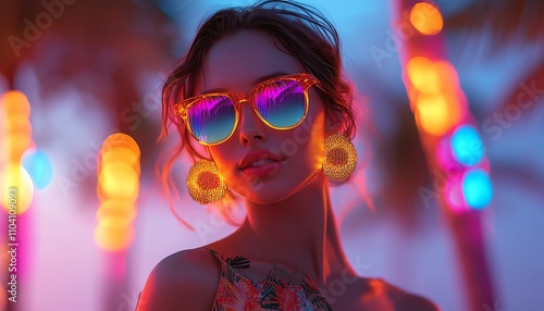 Neon summer party with a vibrant woman in tropical wear, palm trees, and glowing colorful lights
