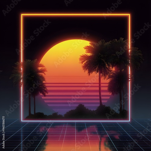 Neon Sunset Oasis: Witness a captivating digital composition of a sunset framed by a neon rectangle, palm trees adding depth, and a subtle grid adding to the immersive aesthetic.