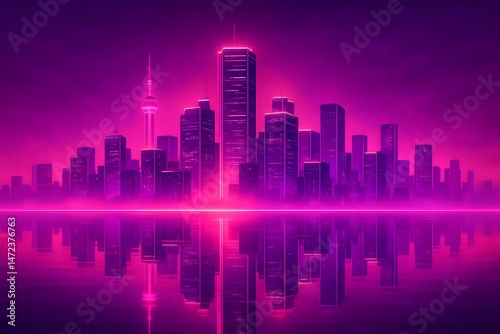 Neon Synthwave City Skyline Reflected in Water - Futuristic Vaporwave Background in Pink and Purple Tones