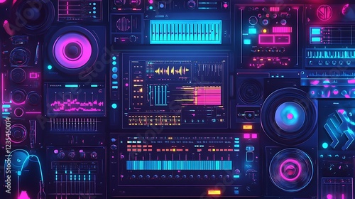 synthesizer, illustration, music, mixer, bright, buttons, speaker, dark, purple, audio, equipment, machine, artwork, digital, 80s, design, production, drum, screen, 90s, blue, light, earphones, keyboard, waveform, control, retro, display, neon, futuristic, pink, vibrant, sampler, knob, technology, colourful, interface, studio, glow, panel, collage, graphic