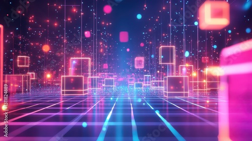 Neon wireframe cubes with scattered glowing dots, forming a futuristic abstract landscape