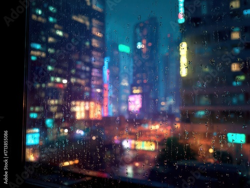 Neon-Drenched Metropolis at Night - Rain-Streaked Cityscape with Blurry Lights and Futuristic Glow.