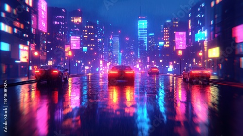 Neon-lit city street at night, wet asphalt reflecting vibrant colors from illuminated buildings and advertisements. Cars drive down the road.