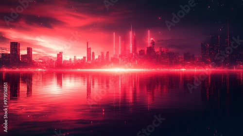 digital, lake, reflecting, glowing, shape, line, futuristic, skyline, distance